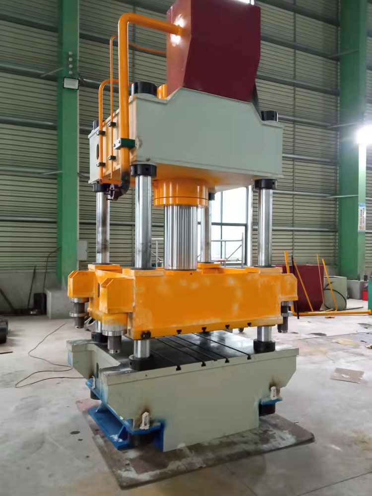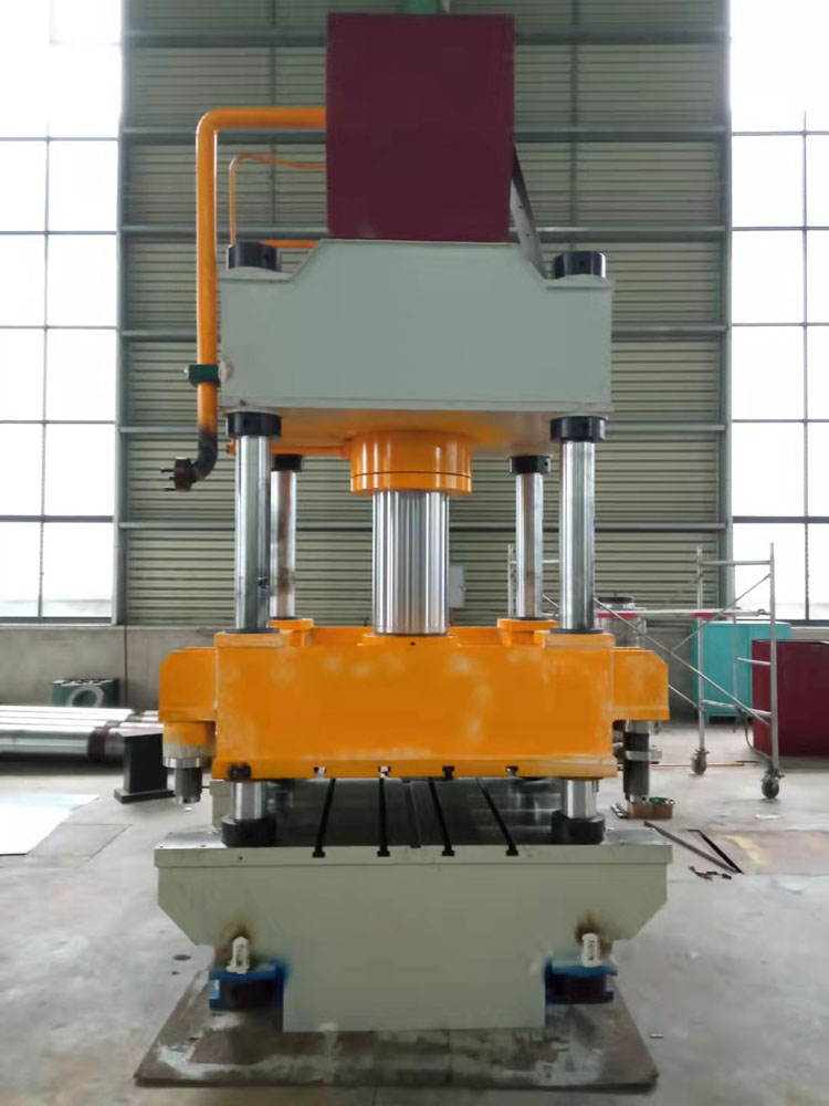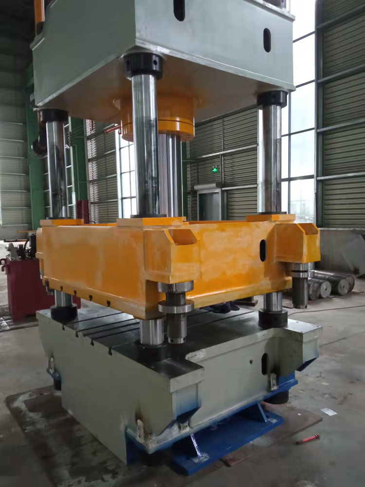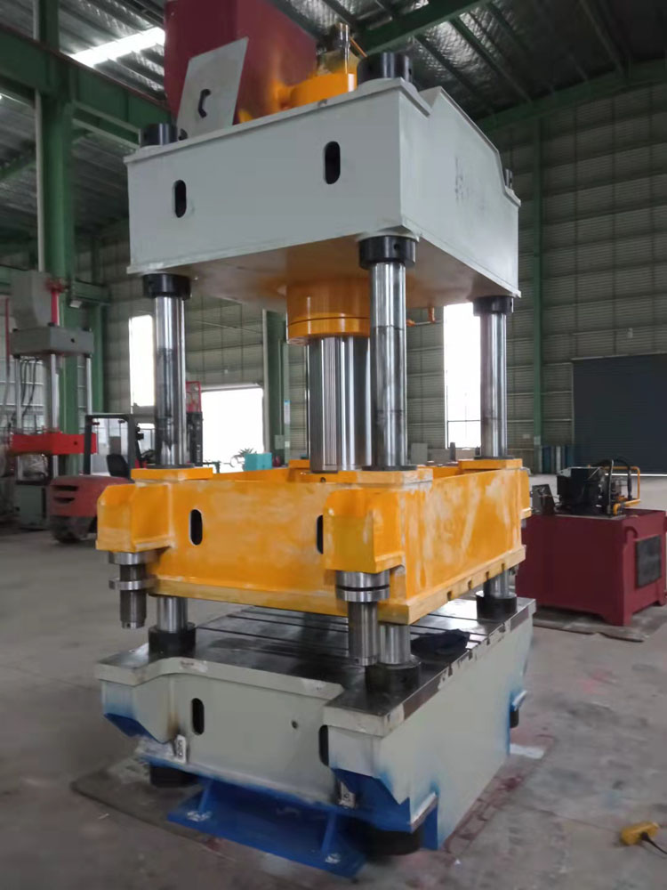 四柱液壓機它是由4根立柱、上橫梁、工作臺以及中間的滑塊形成一個閉合的框架式結構。通過液壓機的油缸輸入向下的壓力,可以使我們需要加工的工件進行變形。液壓機可以用作落料、壓制變形,拉伸等動作。這里我們具體主要談的就是緩沖缸在液壓機里面所起的作用。